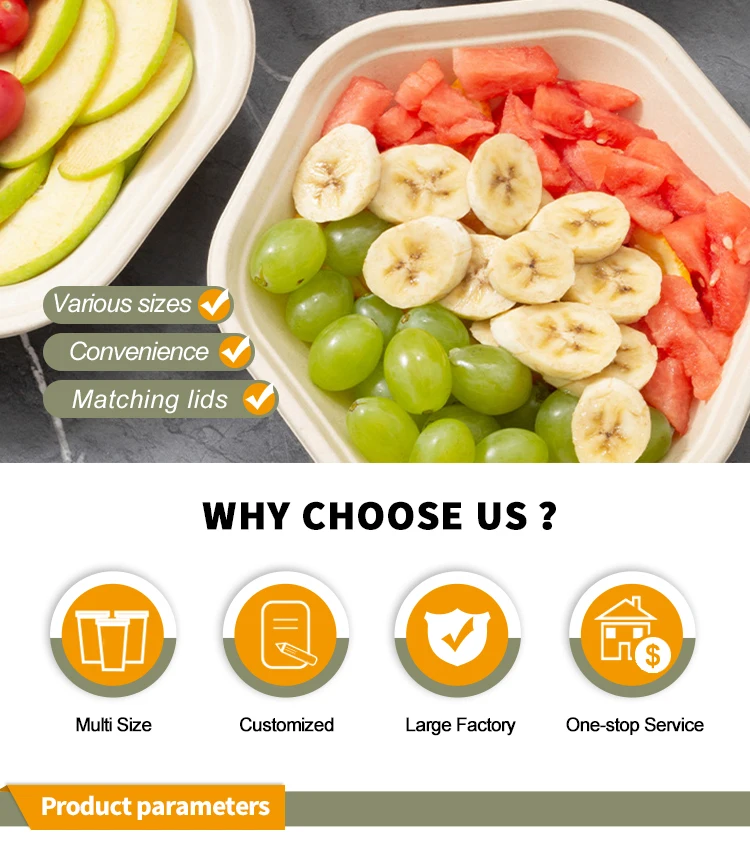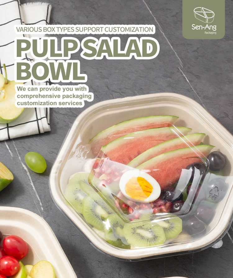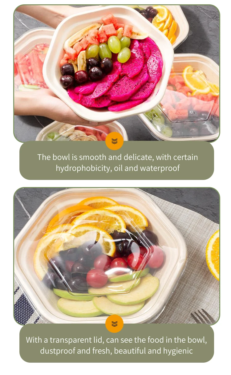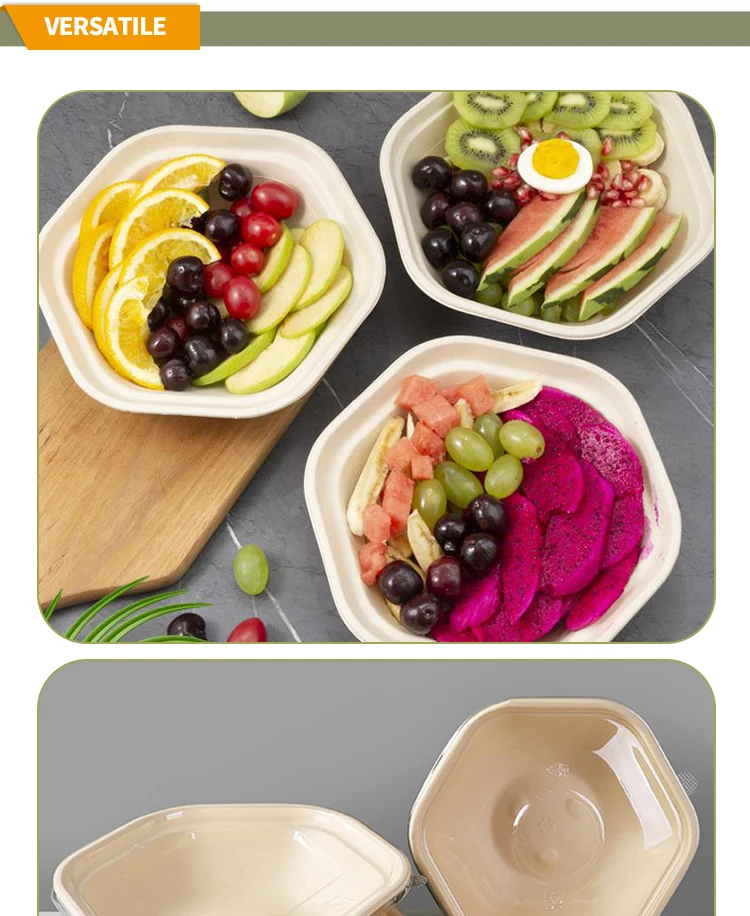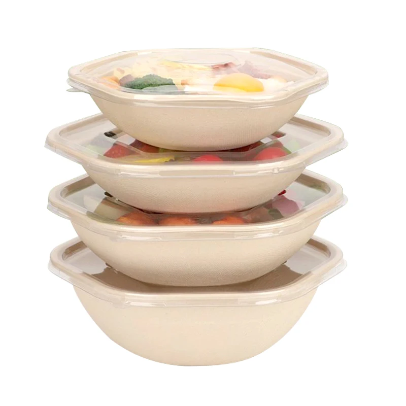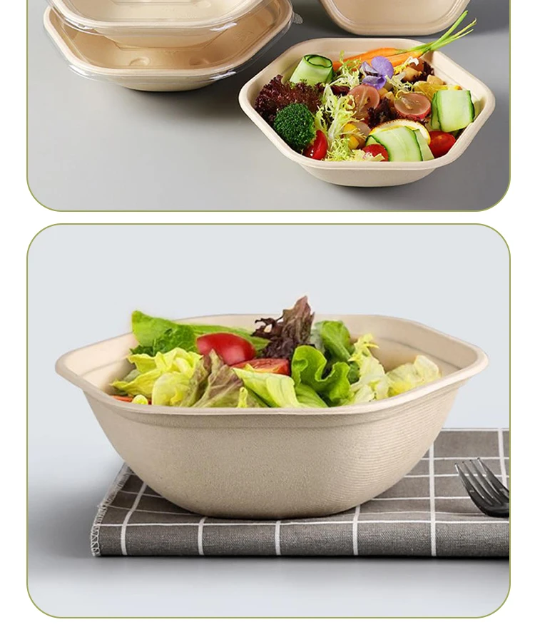 Customizable Biodegradable Hexagonal Sugarcane Bagasse Pulp Salad Bowl with Lid Accessory for Food Packaging and CampingCustomizable Biodegradable Hexagonal Sugarcane Bagasse Pulp Salad Bowl with Lid Accessory for Food Packaging and Camping