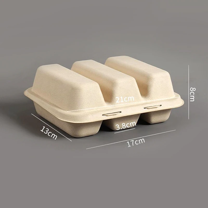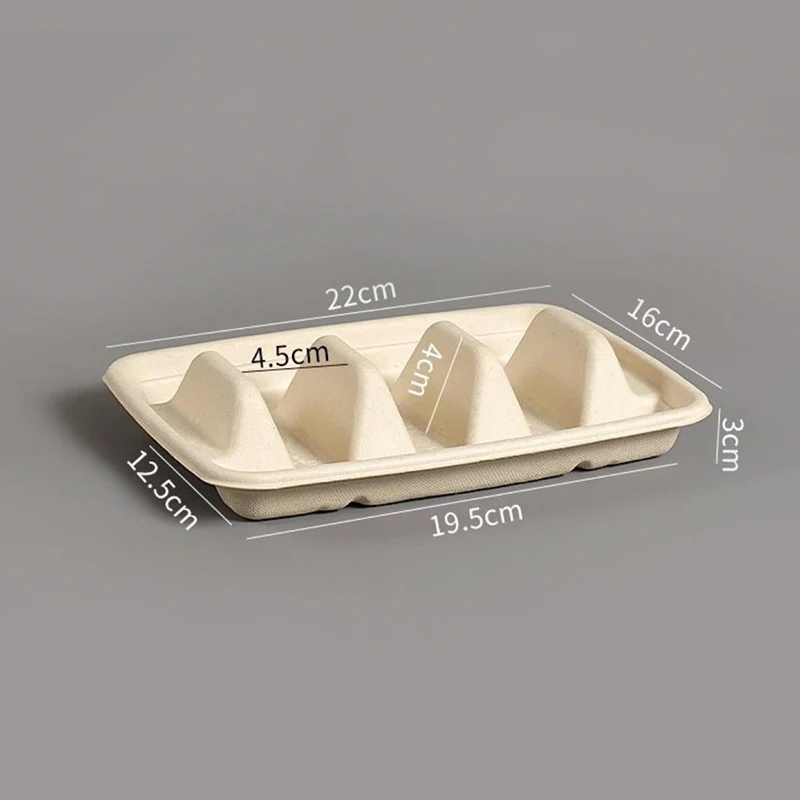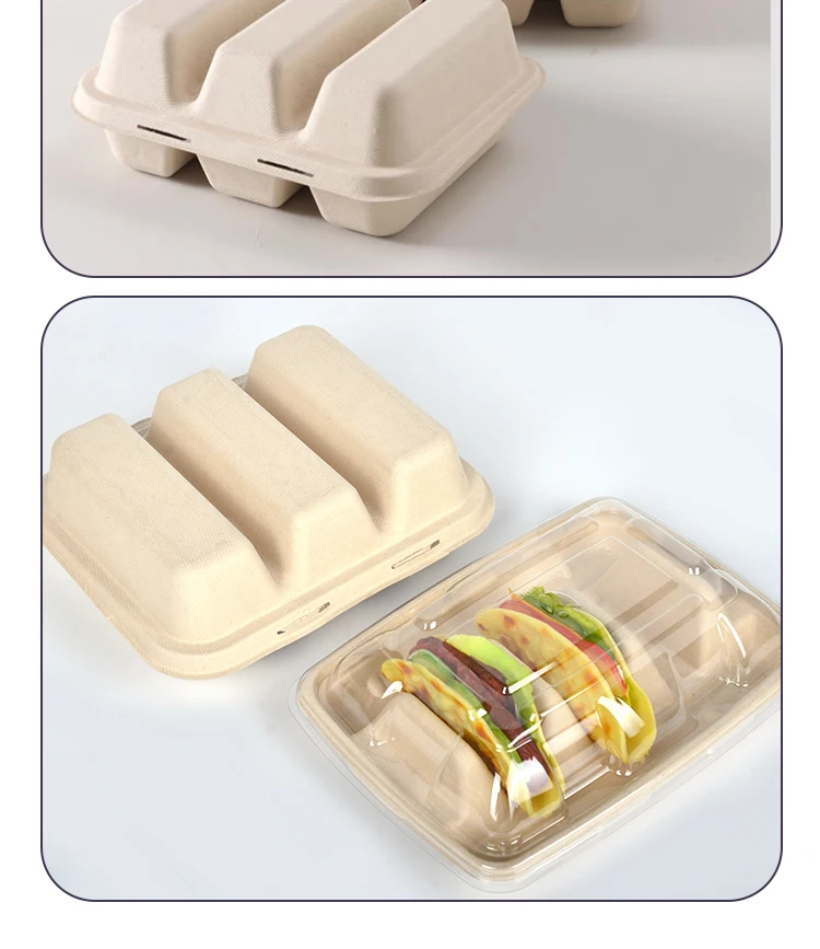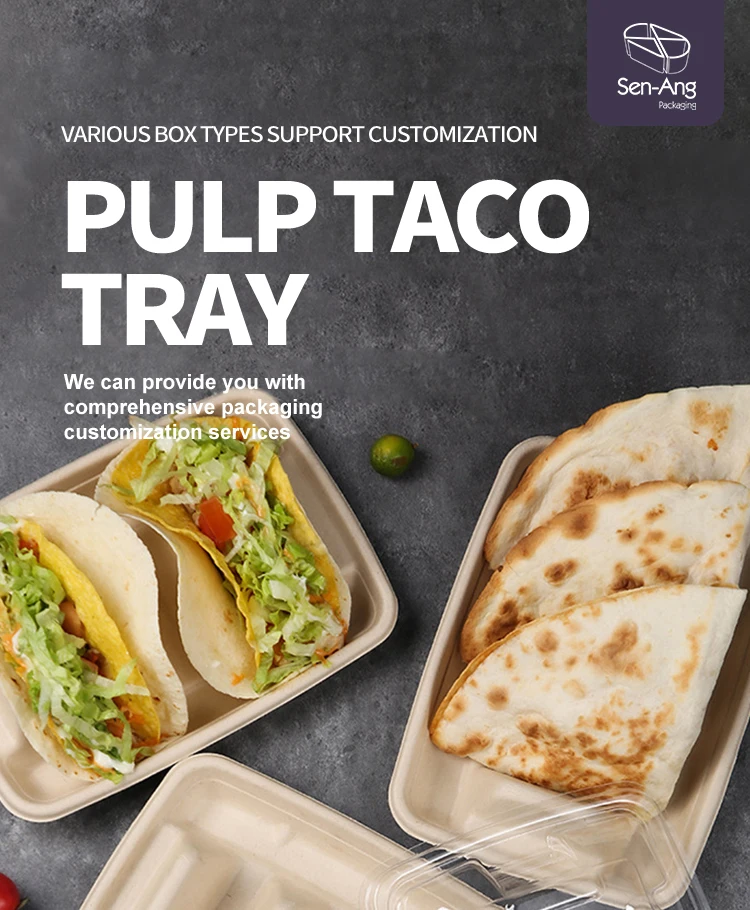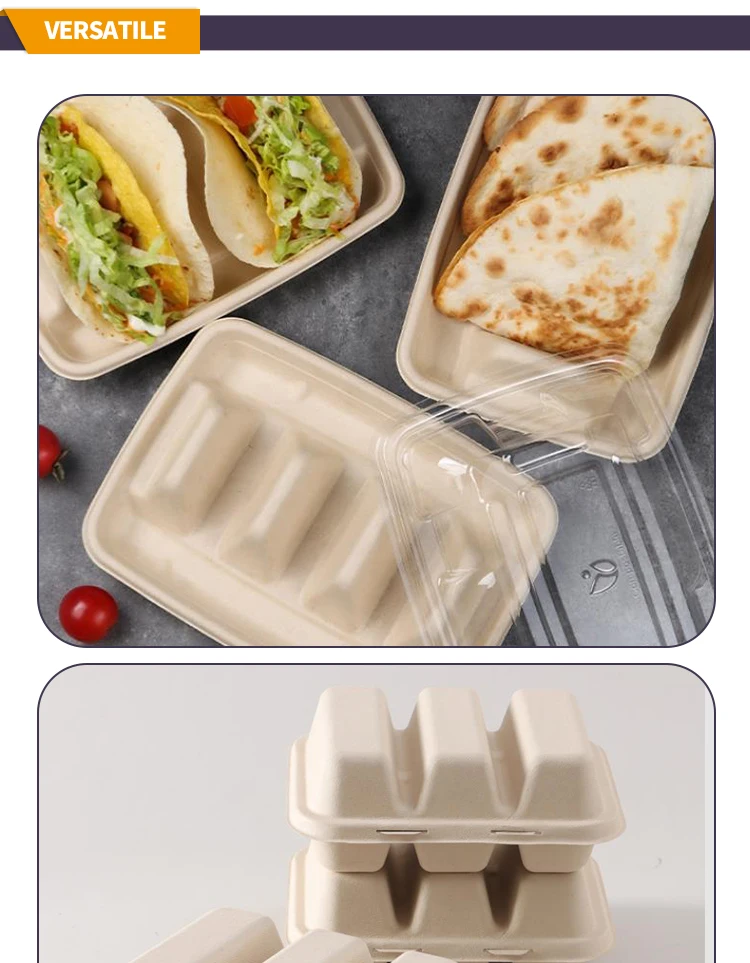 1.Customized Biodegradable Packaging: Our biodegradable bagasse food packaging for tacos is customizable. allowing for the incorporation of your company's logo. making it an excellent choice for businesses seeking eco-friendly and branded packaging solutions.2.Eco-friendly and Natural: Made from sugarcane bagasse. this product is 100% biodegradable and compostable. making it a perfect alternative to traditional plastic packaging that poses environmental harm.3.Versatile Usage: Ideal for a wide range of food applications. our taco packaging is suitable for various food items. such as noodles. milk. burgers. bread. chewing gum. sushi. jelly. sandwiches. sugar. salad. olive oil. cake. snacks. chocolate. pizza. cookies. seasonings. canned food. candy. baby food. pet food. potato chips. nuts. and other food products.4.High-Quality Materials: Our biodegradable bagasse packaging is made from superior wax-coated paper. ensuring durability and protection for your food products. It also features embossing printing. providing an elegant and visually appealing presentation.5.Competitive Pricing and MOQ: With a competitive pricing structure and a minimum order quantity of 50.000 pieces. our biodegradable bagasse food packaging for tacos is an affordable and practical option for businesses looking to transition to eco-friendly packaging solutions.