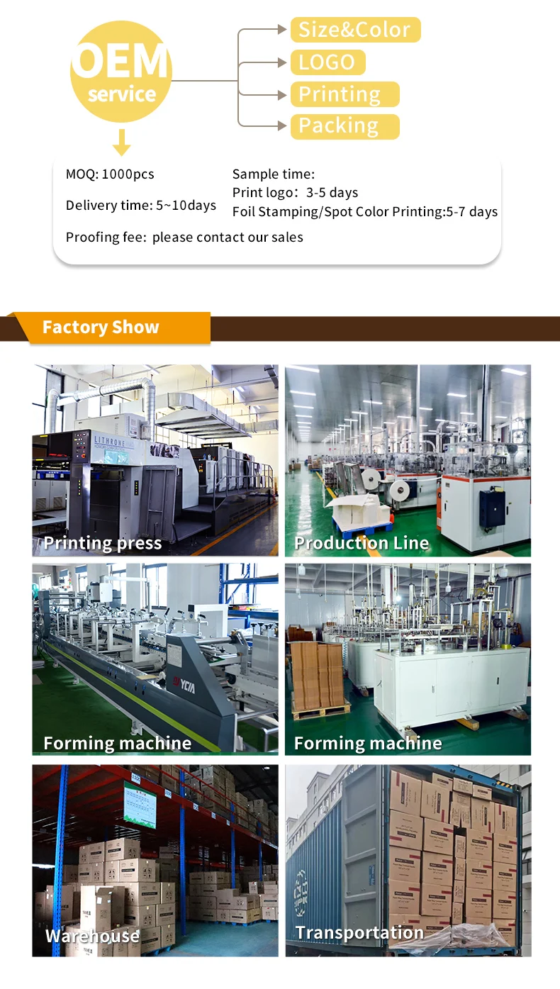 Q1: What kind of company are you?is a new green technology company specializing in providing food packaging solutions to customers. with its own factories and R&D centers. We have been focusing on supplying disposable packaging and accessories products for more than 16 years. Our products have been exported to more than 100 countries. including North America. South America. Australia. the Middle East. Southeast Asia. Africa. and more.Q2: What products can I buy from you?Our products cover a variety of food packaging containers. such as paper bowls. take away boxes. paper cups. lunch boxes. paper bags. paper plates. paper trays and sugarcane pulp food boxes. as well as food packaging accessories. Our best-selling products include: paper bowls. paper food boxes. ice Cream Cups. Fried Chicken Boxes.Hamburger Boxesand fruit boxes .Q3: Can I customize our products and printing?Our services focus on customization. including those for product materials. sizes. brand-printed patterns and logos. as well as packaging structure and format. Our factory boasts a professional team with rich experience in packaging design and manufacturing.Share your ideas with us. and we will help you bring them to life.Q4: How do you guarantee the quality of your products?·boasts over 20 years of experience in the R&D and production of eco-friendly packaging. and maintains strict quality control standards for paper food packaging.·We have established dedicated QA (Quality Assurance) and QC (Quality Control) departments. which are tasked with conducting professional quality inspections on all our products.·To ensure quality compliance. samples are available for your quality assessment both prior to and following mass production.Q5: When can I get your price list?For a quicker quote. send details via WhatsApp or WeChat (including: product dimensions. material. quantity. printing requirements and trade terms). or submit an inquiry via email or our website. We will assign a dedicated person to assist you within 24 hours.Q6: Can I get samples for free?Yes. there is no charge for standardized product samples. But you may need to pay for shipping cost.Q7: How long does it take for mass production?Products in stock can be shipped within 3 days. while customized orders will be produced and shipped within 15-30 days after payment. The specific delivery time varies depending on factors such as product type. order quantity. trade terms. and destination country.Q8:Do you offer sea or air freight? Do you offer sea or air freight? We have our own logistics team and freight forwarders. ready to handle shipping space booking and cargo loading for you anytime. For full container load (FCL). goods can be loaded at our factory. helping better avoid damage.Q8: May I visit the factory?Of course. you are welcome to visit our factory or entrust a third-party organization to conduct inspections.Please feel free to contact us. and we will be dedicated to serving you.