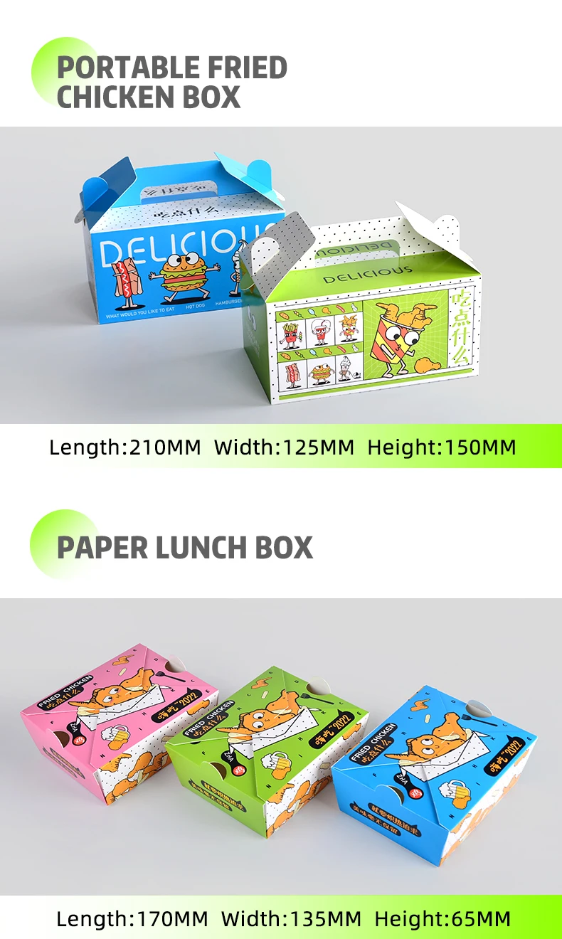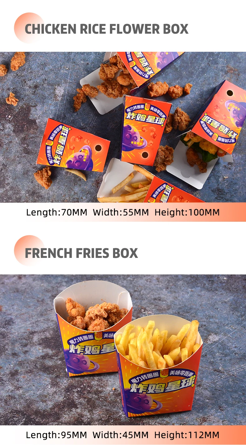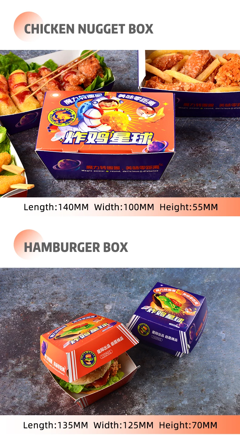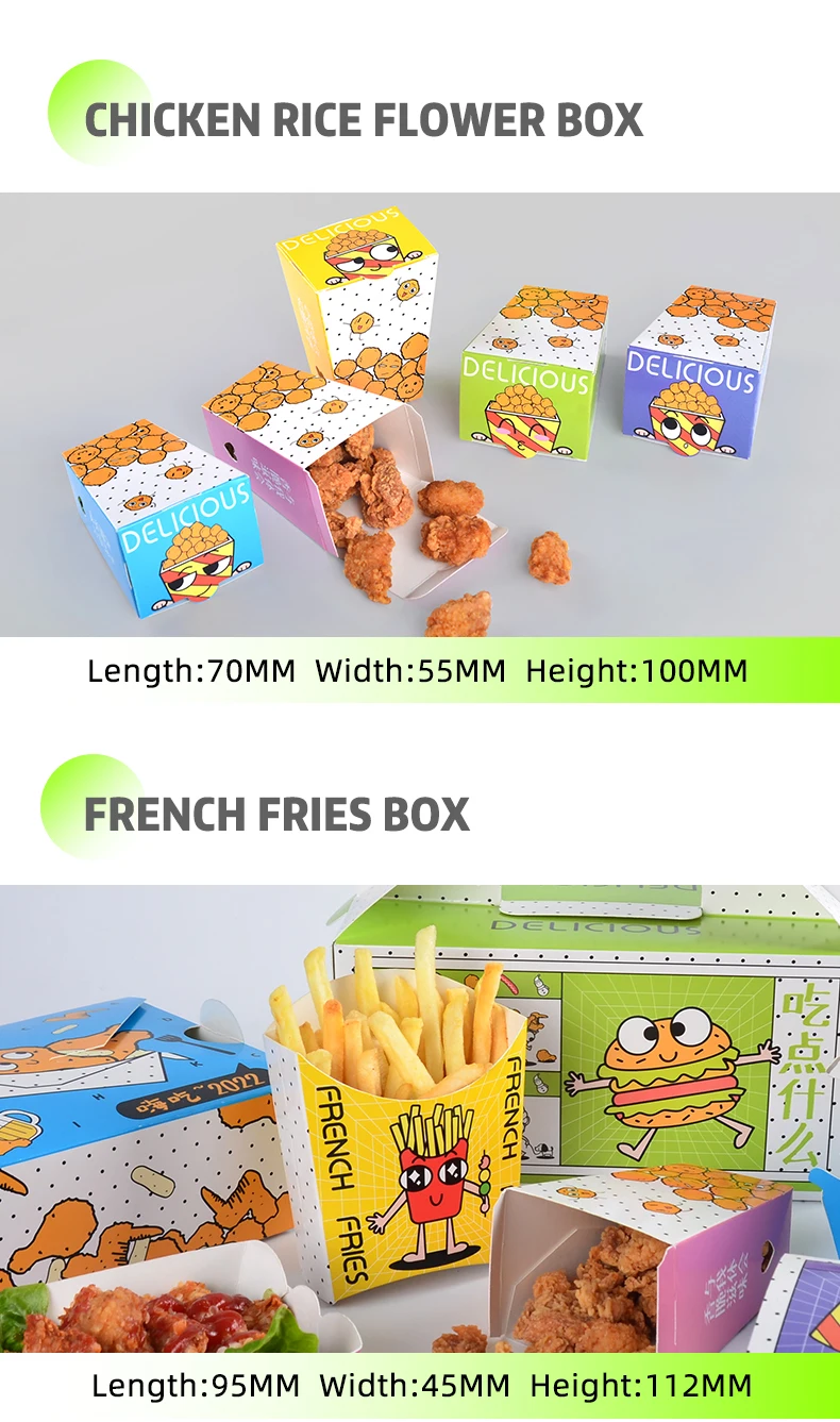 Boat box 150*110*35mm, Chicken nugget box 140*100*55mm, Chicken rice flower box 70*55*100mm, French fries box 95*45*112mm, Hamburger box 135*125*70mm, Packing box 170*135*65mm, Portable fried chicken box 210*125*150mm