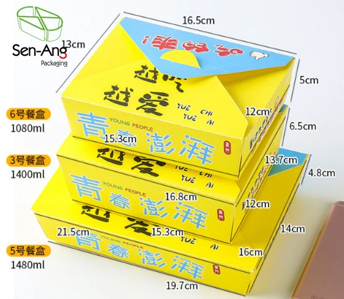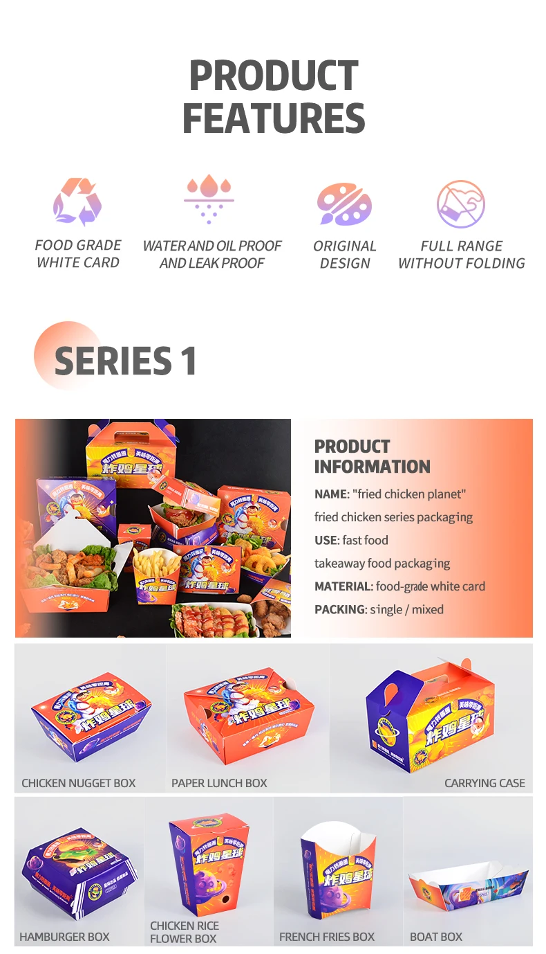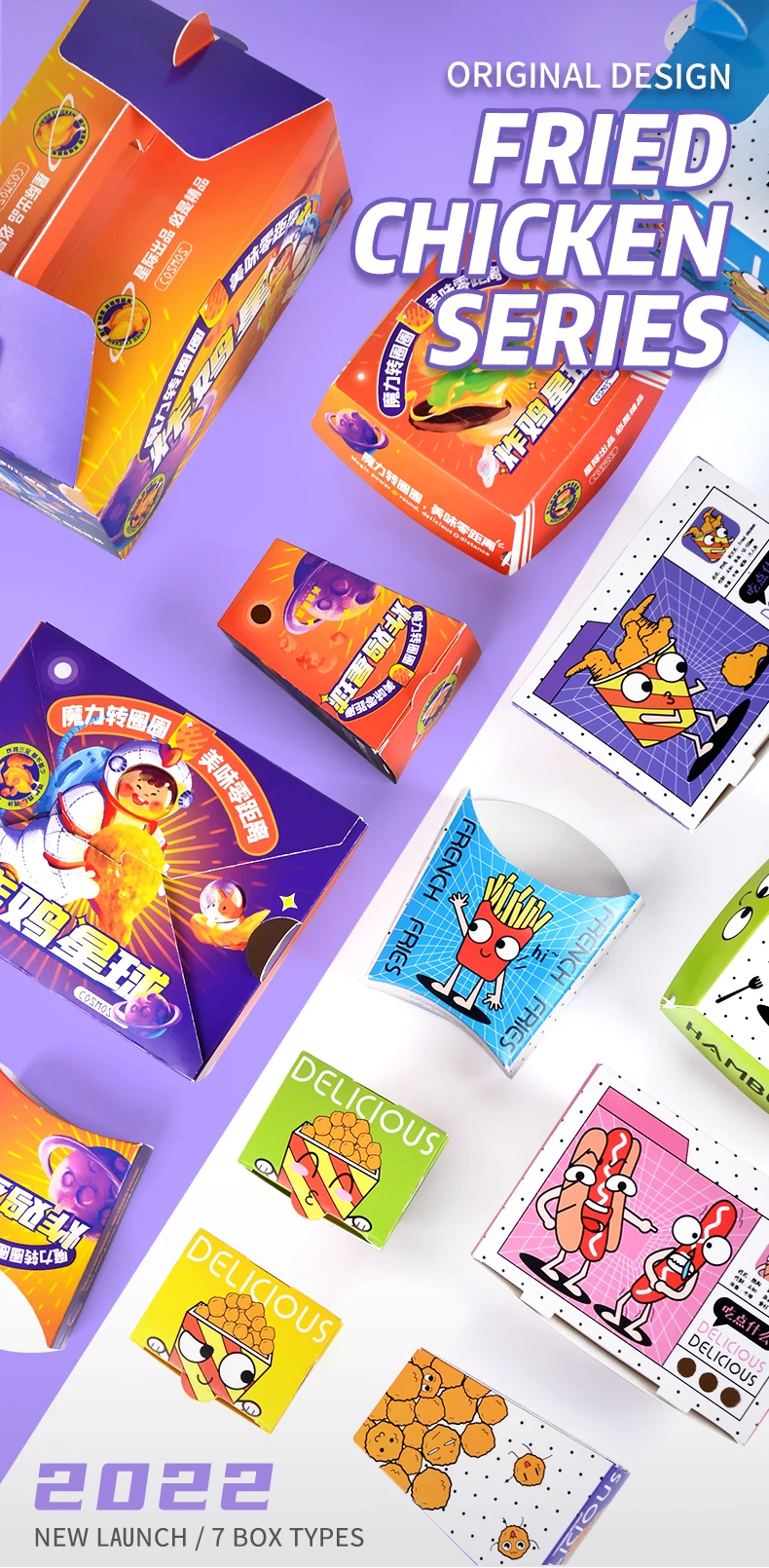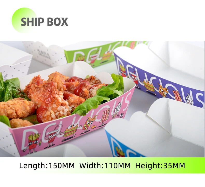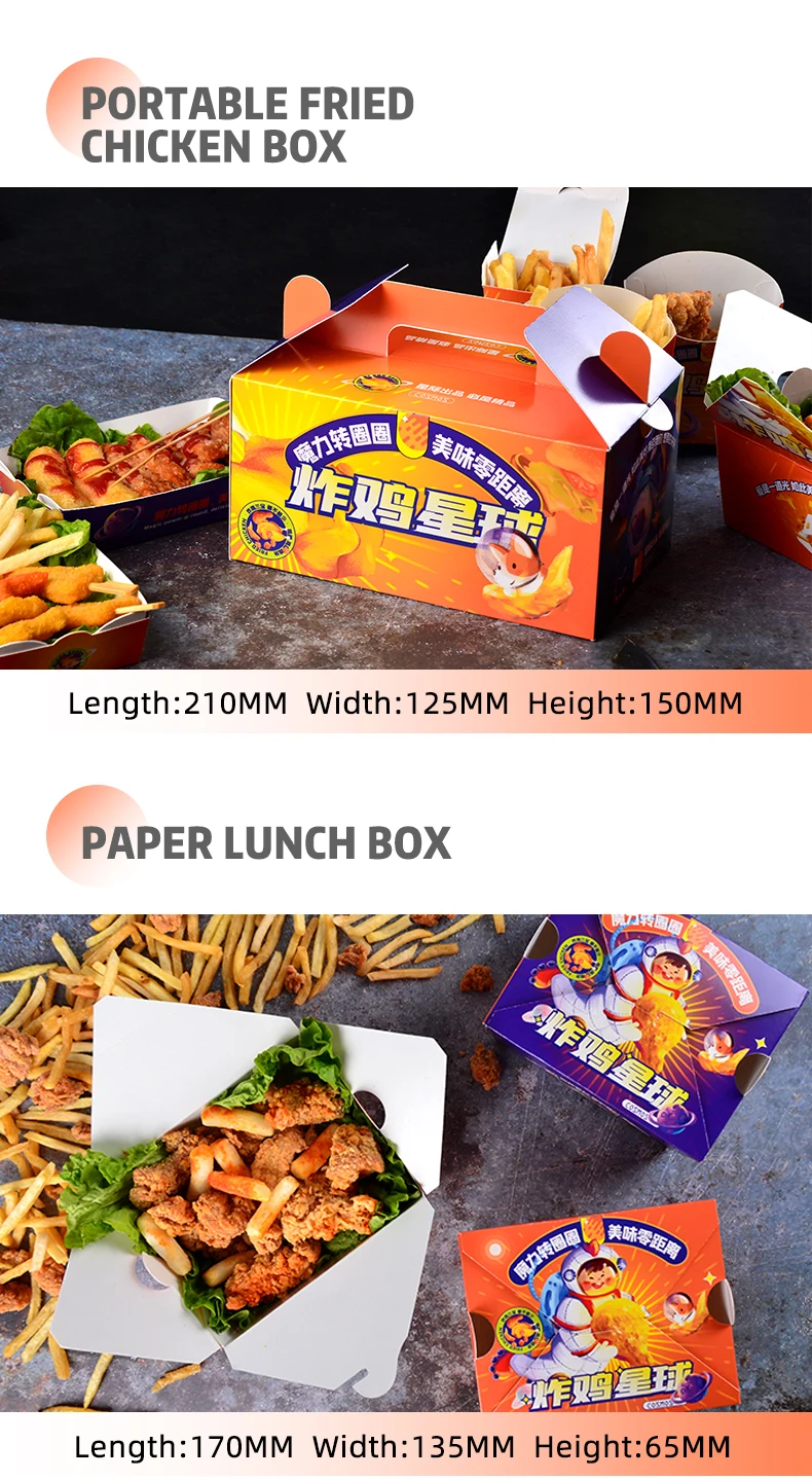 Boat box 150*110*35mm, Chicken nugget box 140*100*55mm, Chicken rice flower box 70*55*100mm, French fries box 95*45*112mm, Hamburger box 135*125*70mm, Packing box 170*135*65mm, Portable fried chicken box 210*125*150mm