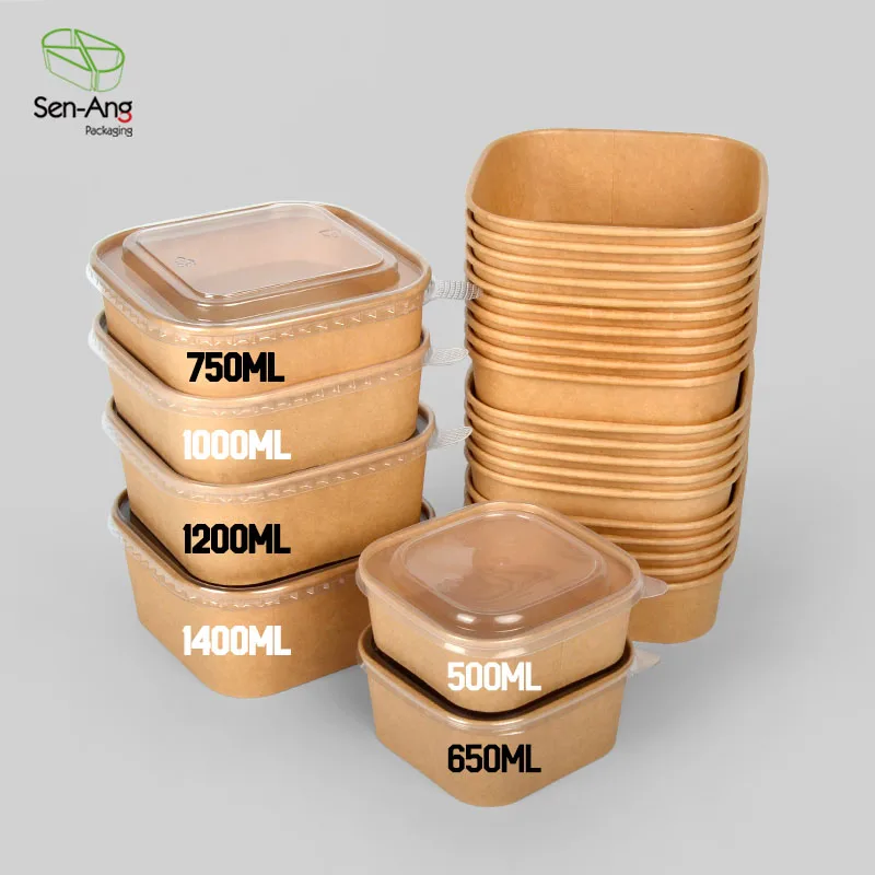 White Brown Takeout Square Rectangular Waterproof Oilproof Soup Disposable Kraft Paper Salad Bowl with Lid